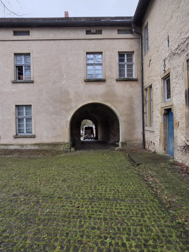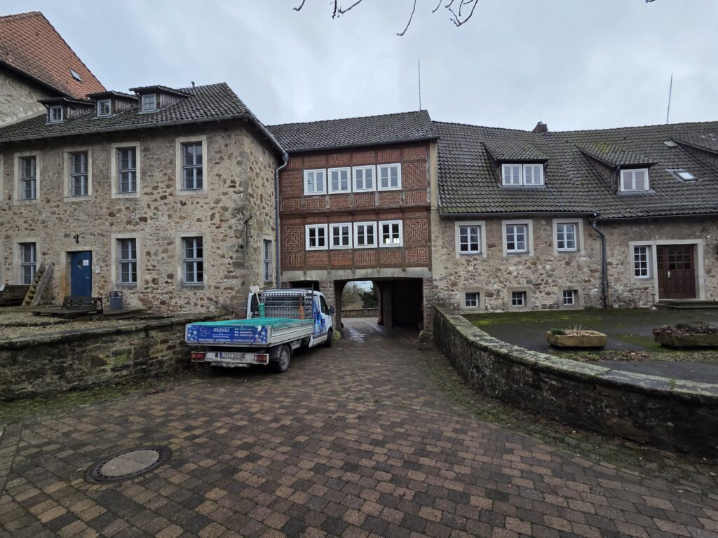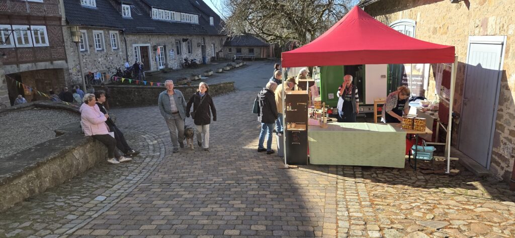 - Der große Vorburghof: Dieser weitläufige Bereich bietet idealen Platz für größere Marktstände, Informationswagen und gastronomische Angebote. Die historischen Mauern schützen vor Wind, während die herbstliche Atmosphäre des Extertals den perfekten Rahmen für den Verkauf von Honig- und Wachsprodukten bietet.