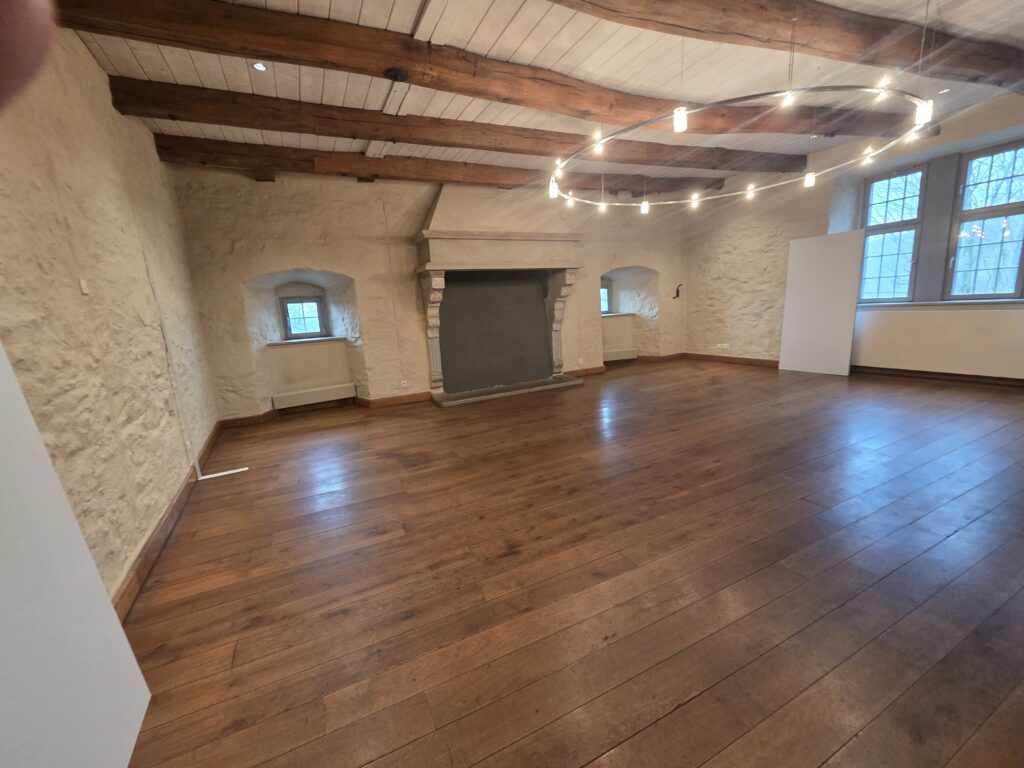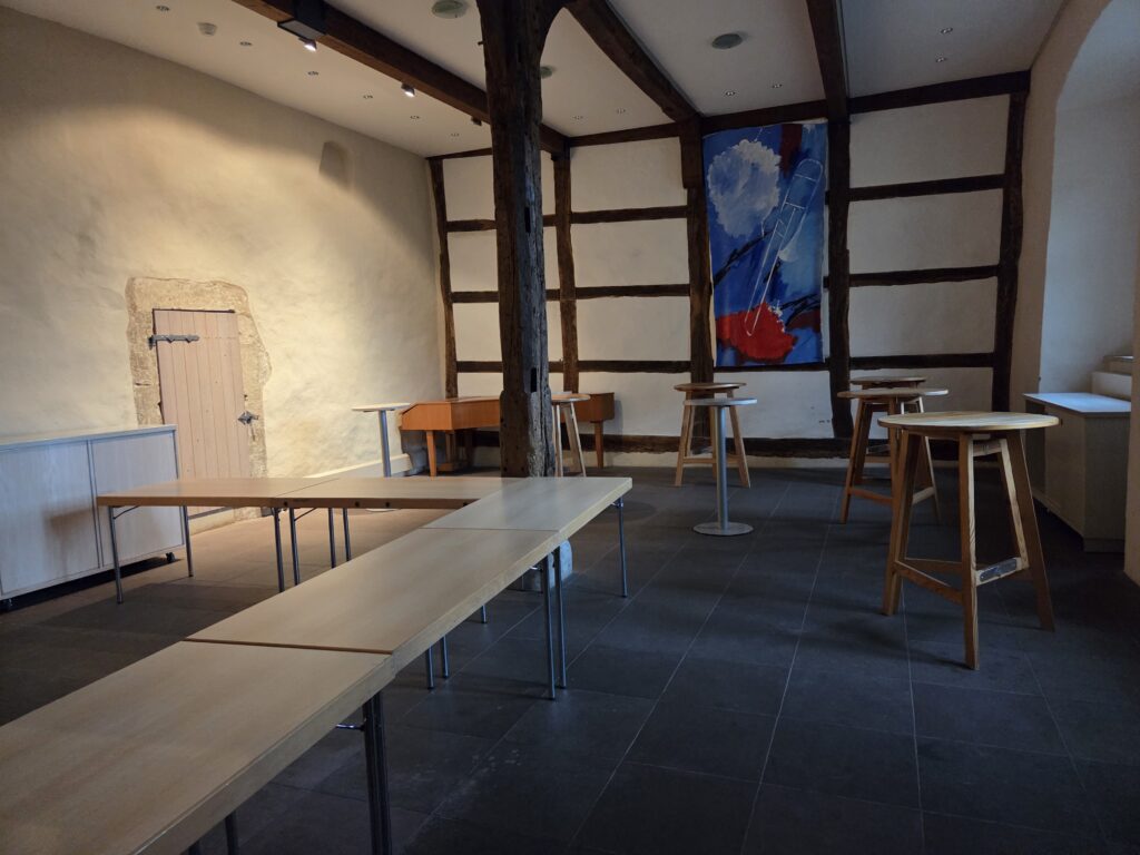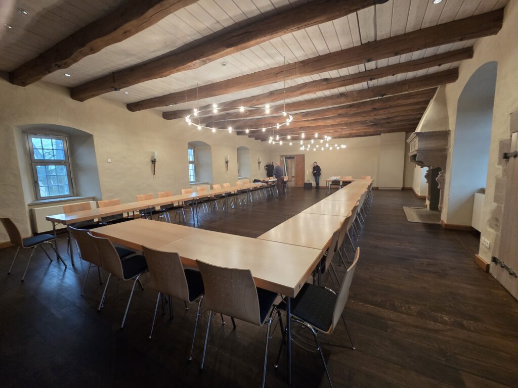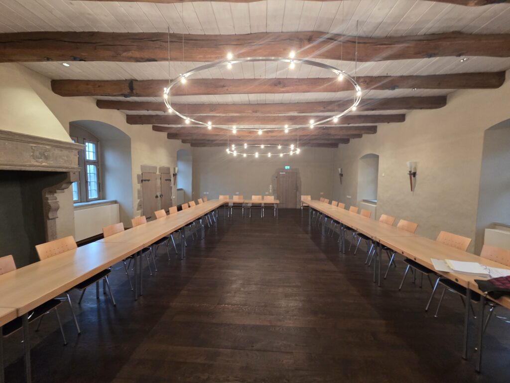 - Der Rittersaal: der repräsentativste Raum der Burg. Mit seinen massiven Holzbalken und dem historischen Ambiente ist er der prädestinierte Ort für die offizielle Eröffnung, Fachvorträge der Obleute oder die feierliche Honigprämierung durch den Vorstand (um Dr. Thomas Klüner).