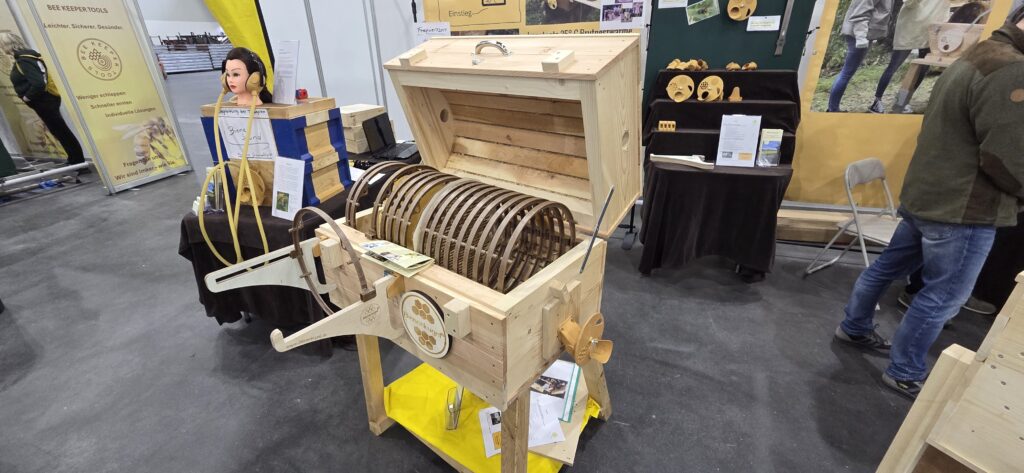 - Beutenlifte und Transportwagen: Hersteller wie Logiflex oder spezialisierte Imkereiausrüster präsentierten manuelle und elektrische Lifte, mit denen schwere Zargen ohne Rückenbelastung bewegt werden können. Besonders beeindruckend waren die geländegängigen Modelle, die auch in unebenem Wandergelände sicher stehen.