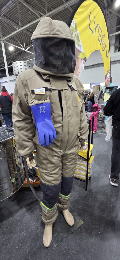 - Velutina-Schutzanzüge: Mehrere Aussteller präsentierten spezialisierte Ganzkörperanzüge, die deutlich dicker und mehrlagig konstruiert sind. Da die Asiatische Hornisse einen längeren Stachel besitzt und Gift spritzen kann, verfügen diese Anzüge über verstärkte Schichten und spezielle Visiere mit Spritzschutz.