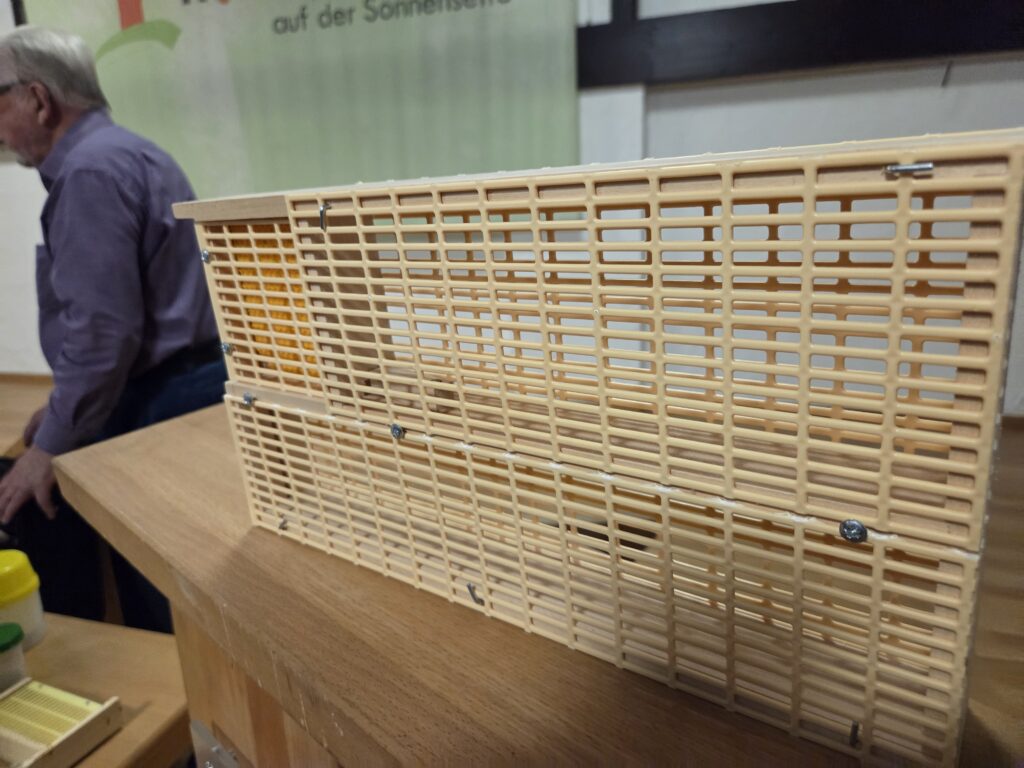 Ein besonderes Highlight des Abends war die Hands-on-Demonstration. Gerdes, der sein Wissen auch online auf seinem Portal imkerei-gerdes.de teilt, zeigte die Handhabung der VaKoFang-Wabe direkt am Objekt.