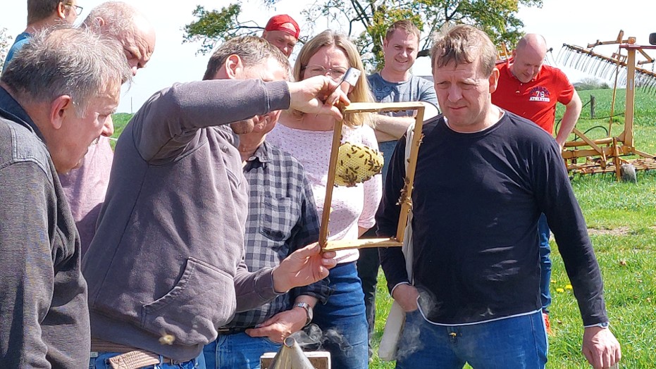 - Live am Volk: Die „Hauptdarstellerinnen“ durften natürlich nicht fehlen. Bei der Standbegehung öffnete der gastgebende Imker seine Beuten und erklärte seine Betriebsweise direkt am lebenden Objekt. Ein Moment, in dem auch erfahrene Imker immer noch etwas Neues entdecken können.
