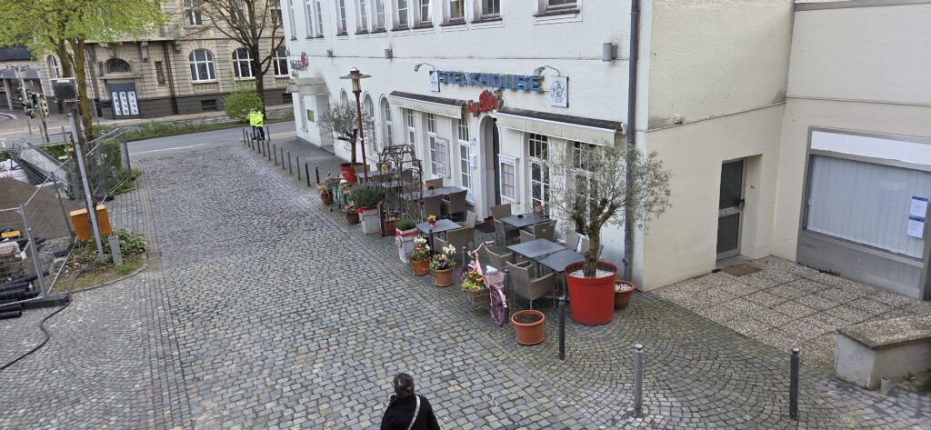 - Rechts – Die Stallungen: Die heutige Markthalle wirkt wie ein Marstall (herrschaftliche Stallungen). Wo heute Markttreiben herrscht, sollte optisch ritterlicher Glanz einziehen.